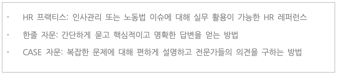 이러한 과정 끝에 새로운 형태의 서비스인 'HR 프랙티스', '한줄 자문', 'CASE 자문'이 나오게 되었습니다.